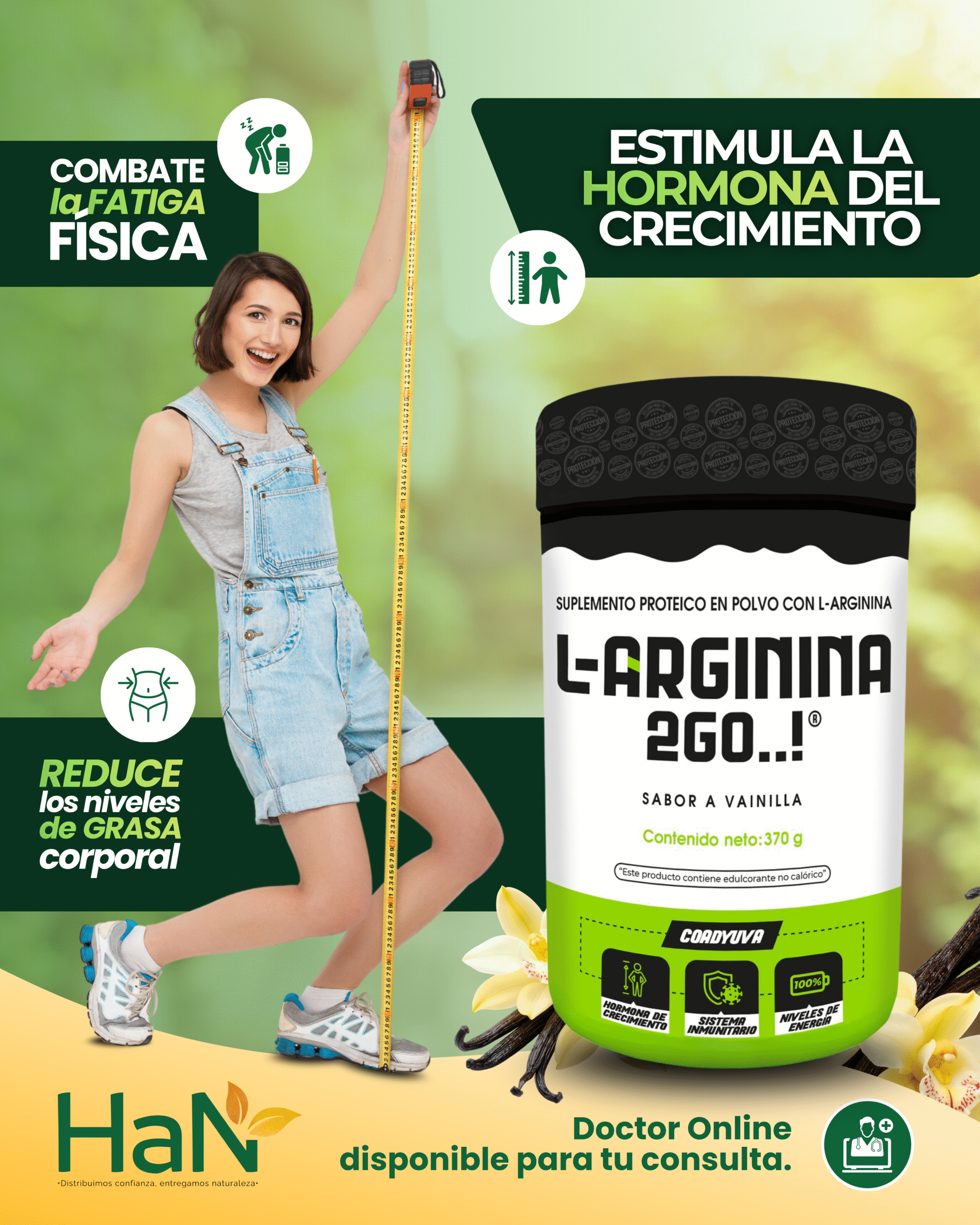 Suplemento de L-arginina + proteína diseñado para apoyar la producción de óxido nítrico, favorecer el flujo sanguíneo y la oxigenación muscular, impulsando el rendimiento y la recuperación en actividades intensas. Ideal para jóvenes activos y deportistas. Sabor vainilla. ⚡💪